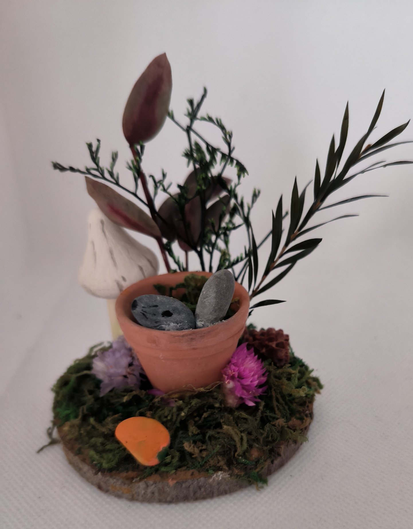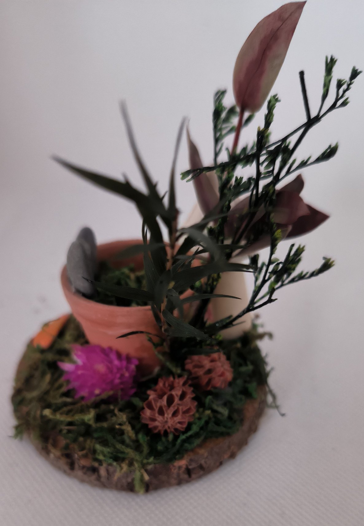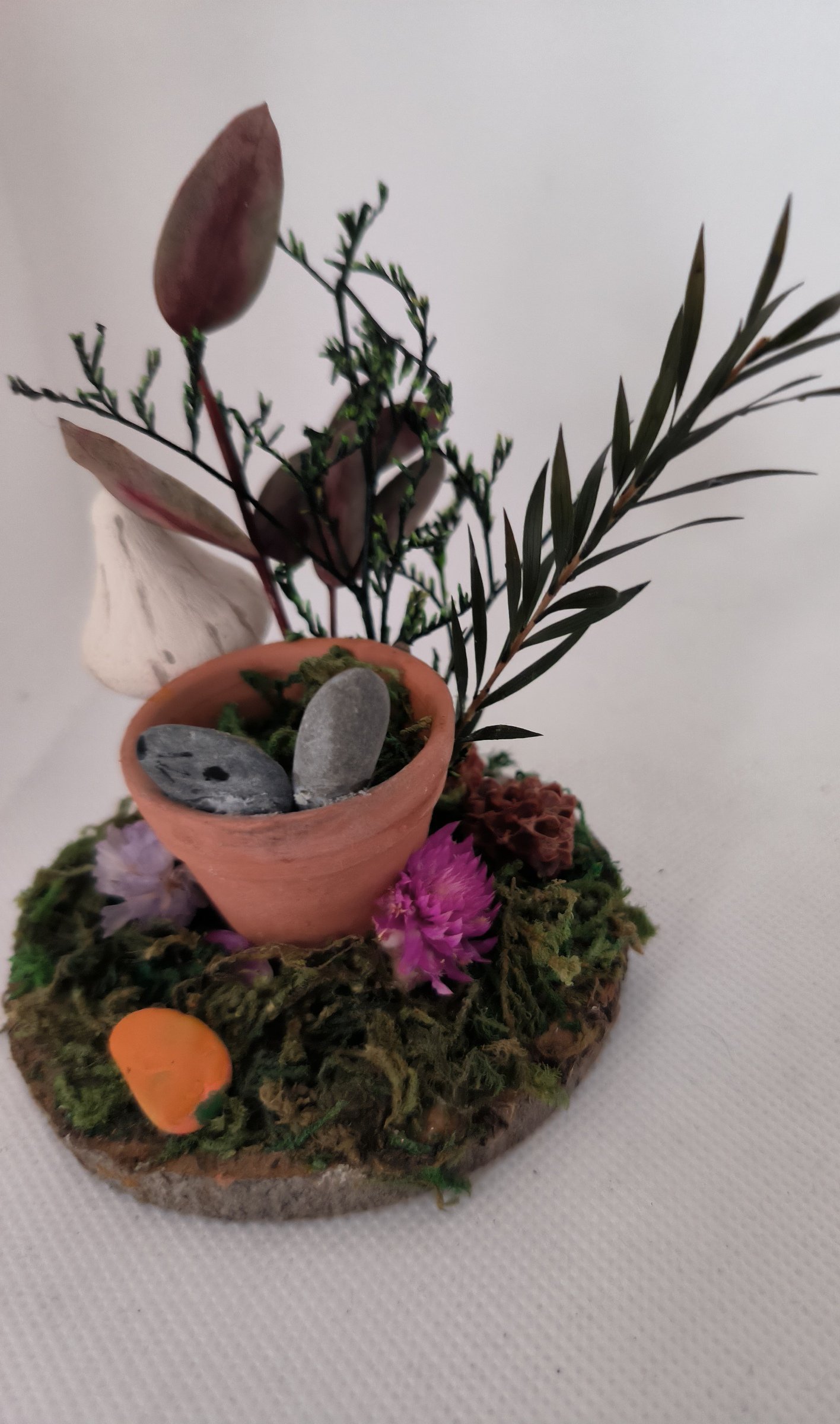 A 7/8 cm logslice with a real mind terracotta pot with a pebble bunny inside ,artificial moss and dried foliage .