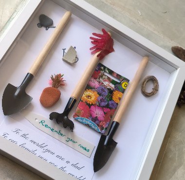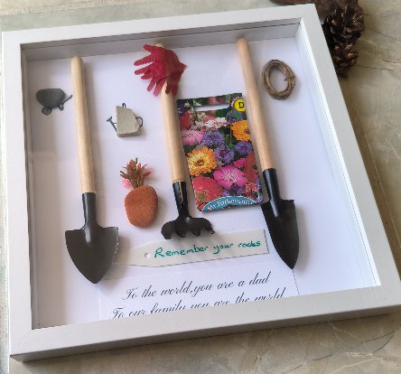 A large frame consisting of seeds,twine ,gardening gloves,watering can, wheelbarrow ,potted plant and mini garden tools.