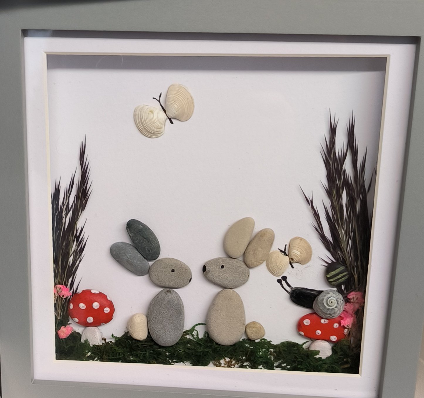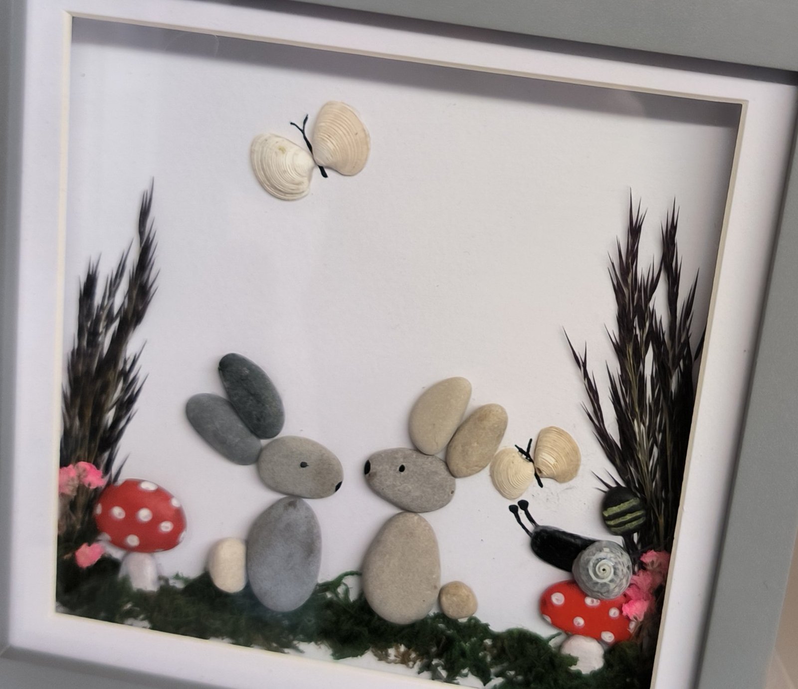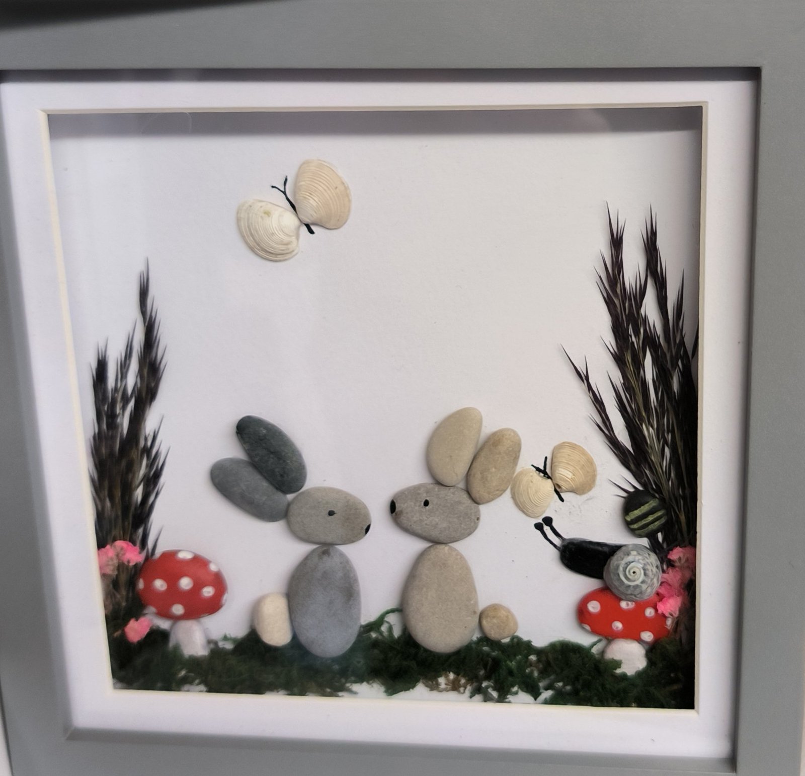 With the use of artificial moss, shells , pebble and dried flowers this makes an adorable frame for any room or a gift for bunny lovers .