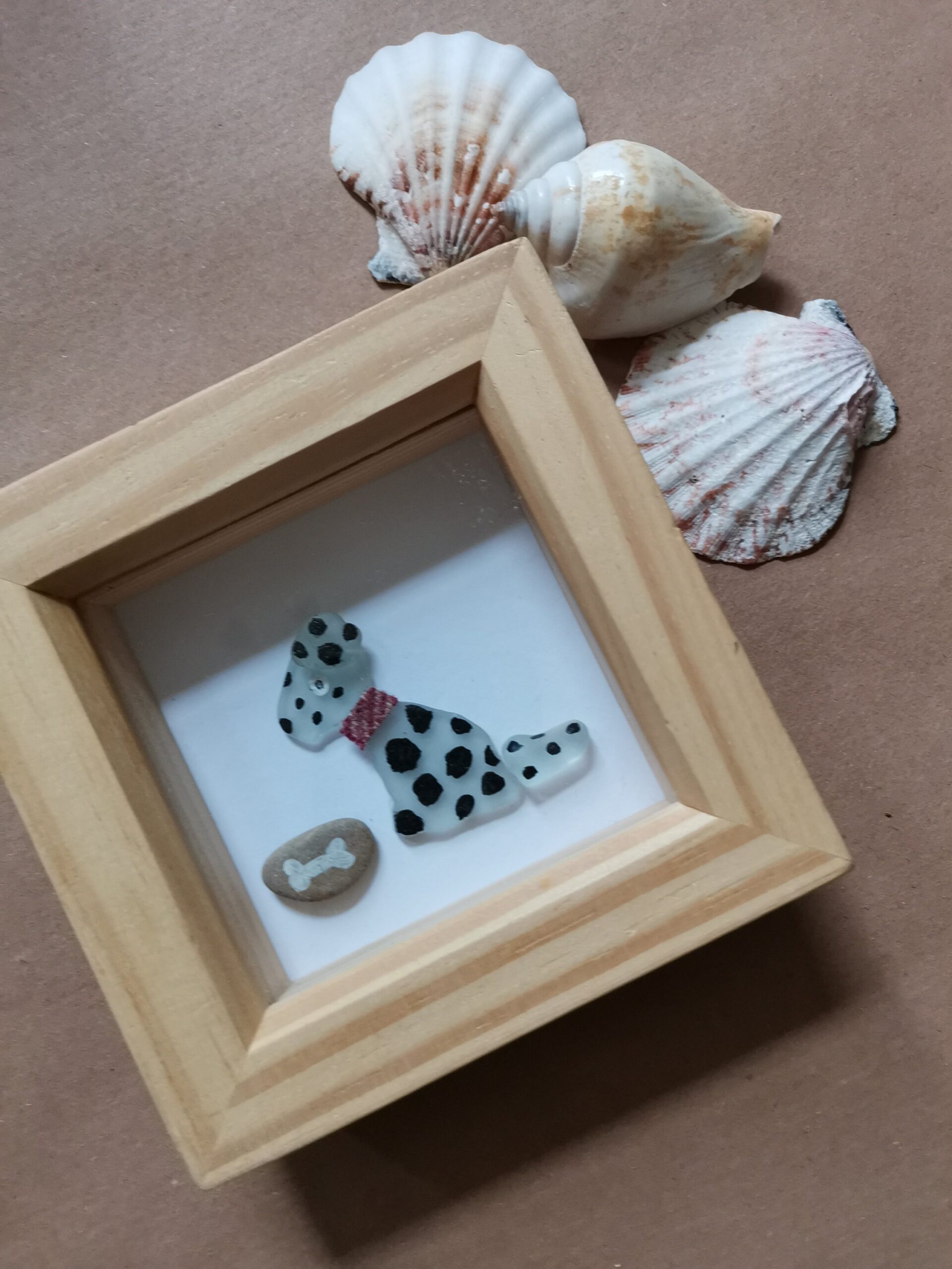 A beautiful Dalmatian created with sea glass and the bowl made from pebble