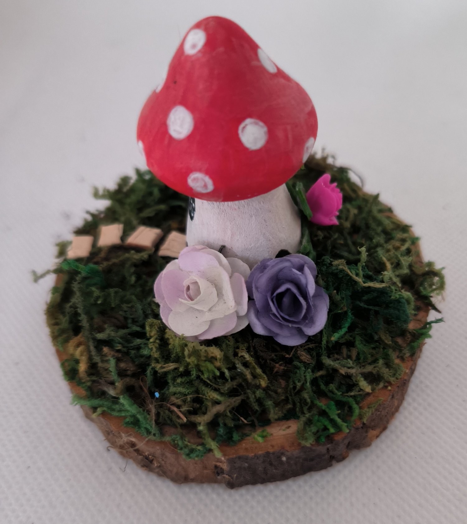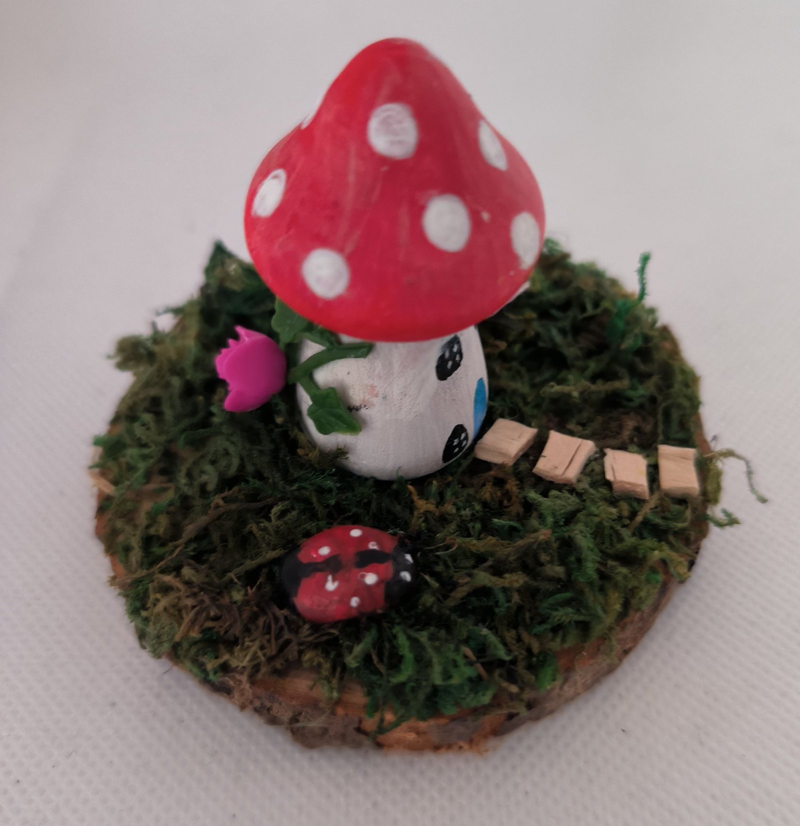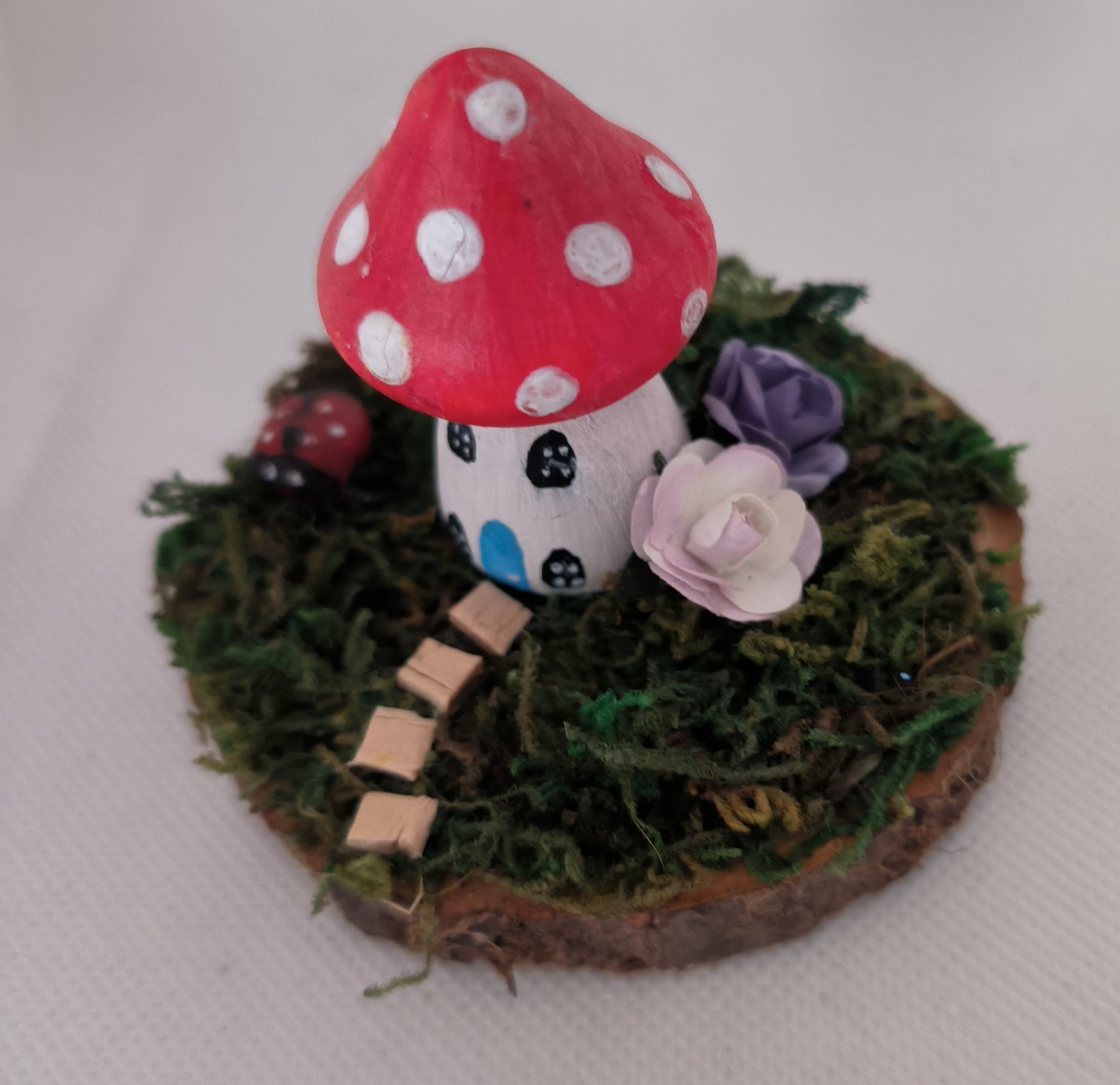 Set on a 7/8 cm logslice with a painted toadstool house with artificial moss, pathway, paper flowers and pebble ladybird.