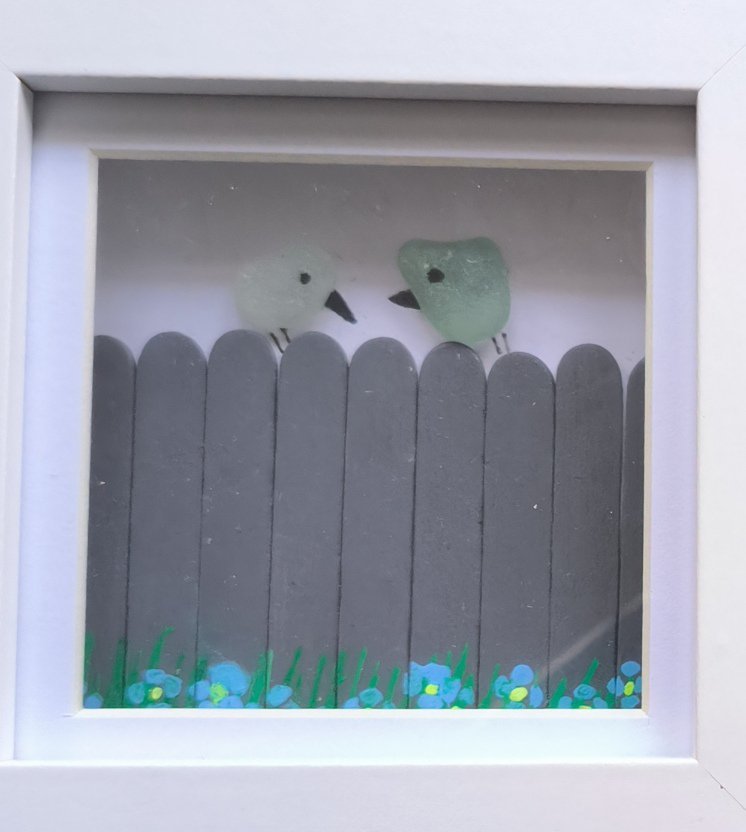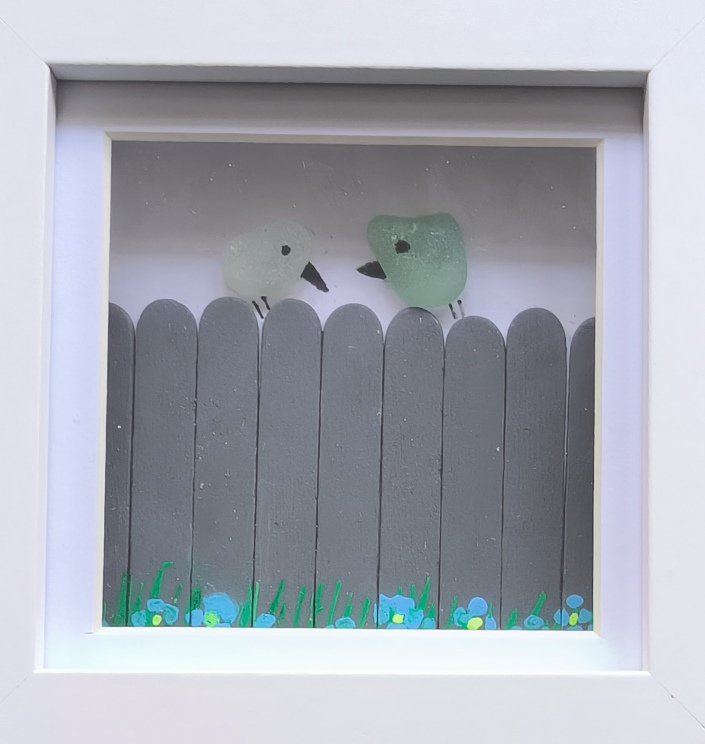 A mini frame with sea glass birds on a wooden fence with painted flowers below.