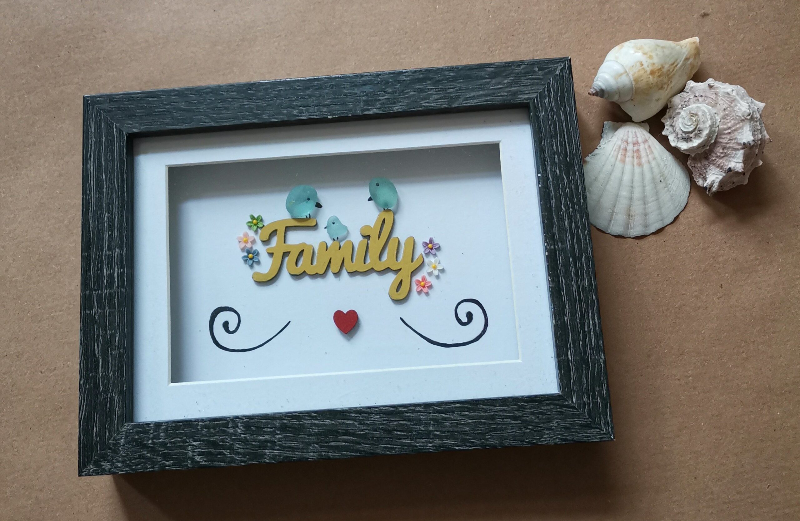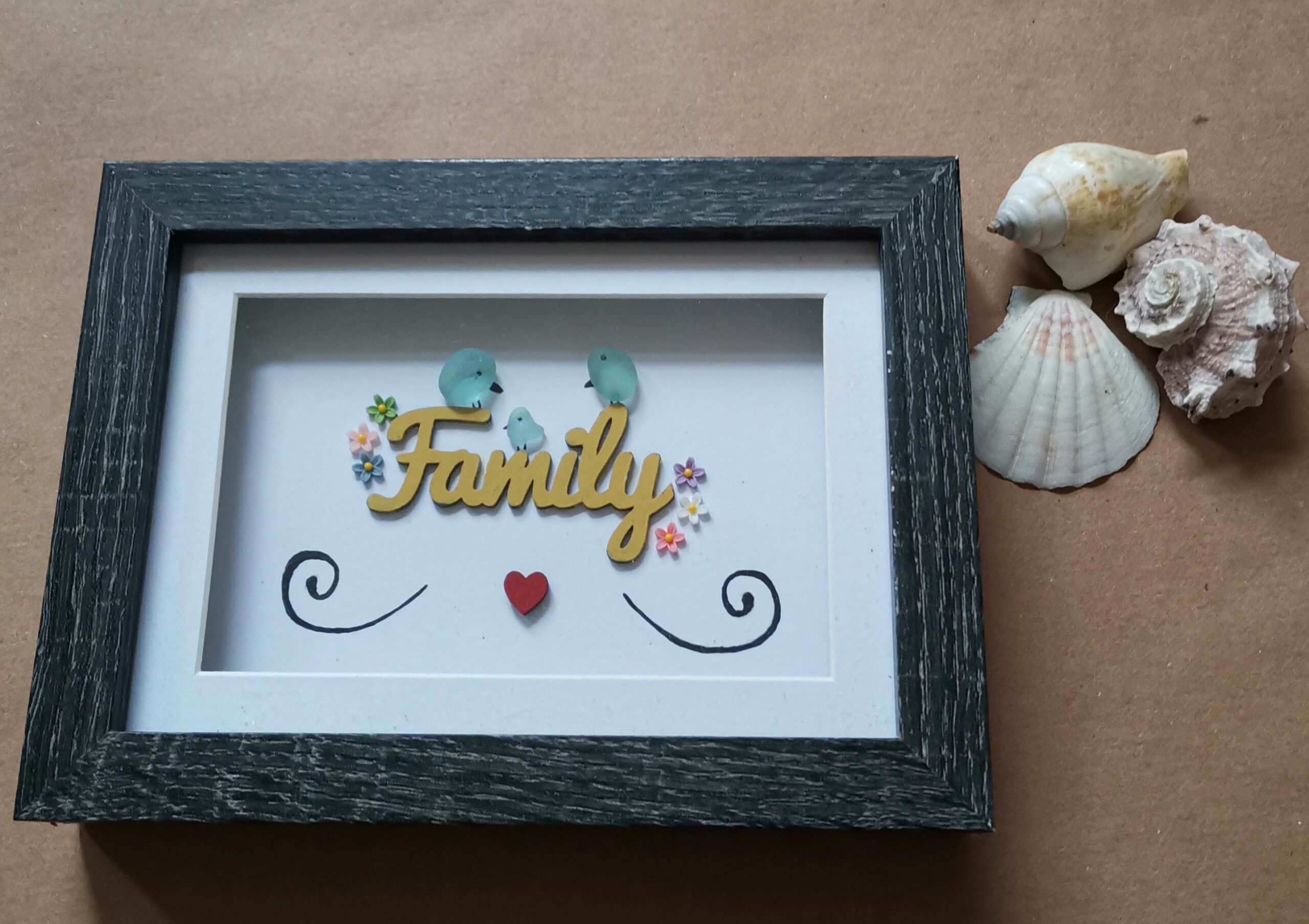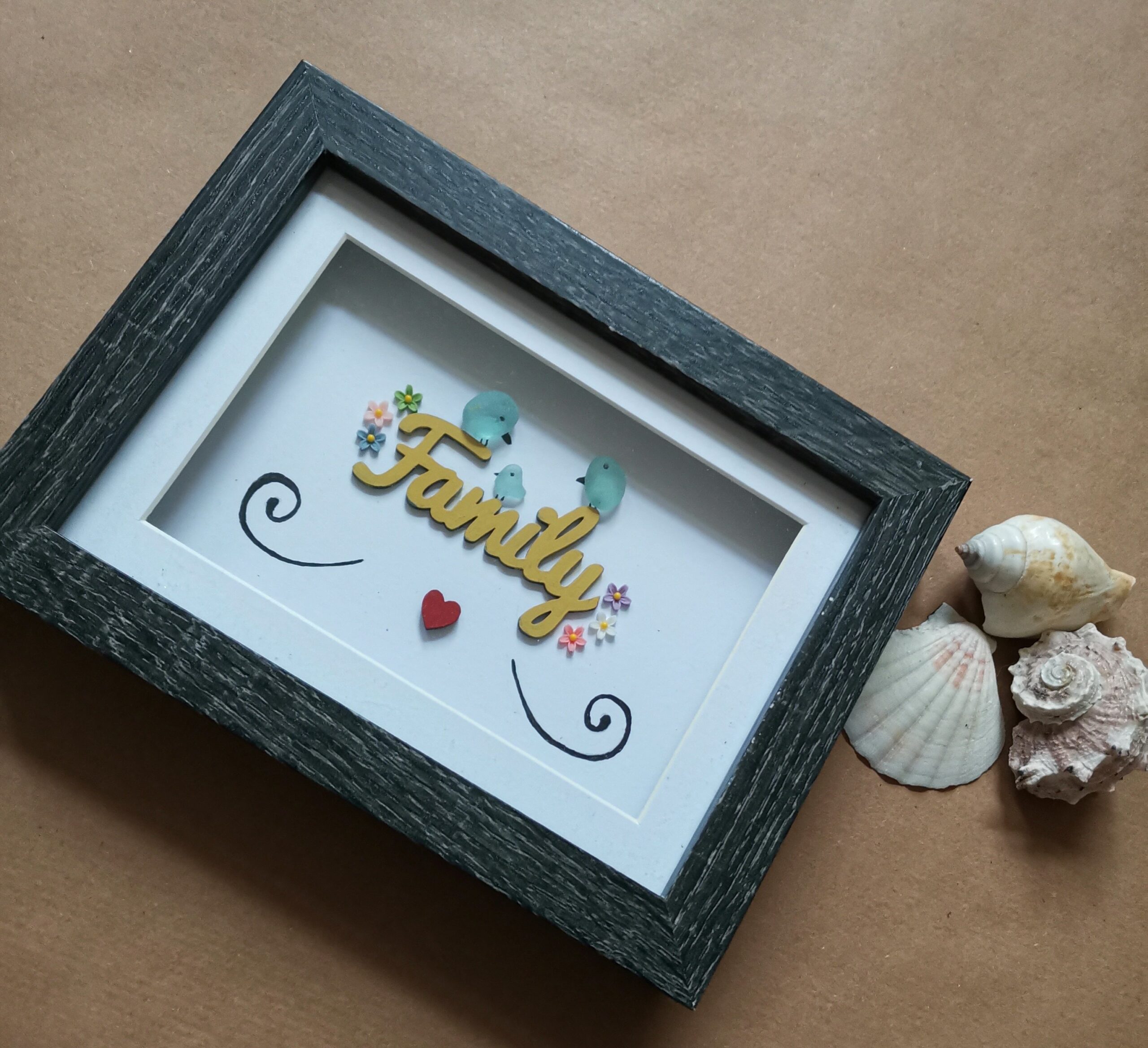 A beautiful ‘Family’ wording painted in a mustard colour with 2 beautiful sea glass birds.
