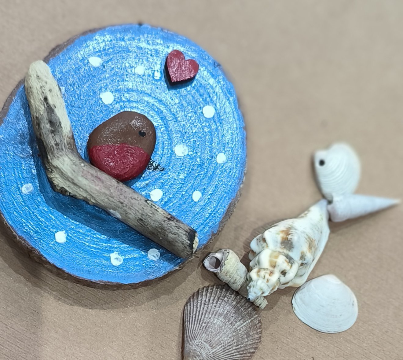 A beautiful robin made from pebbles on a driftwood branch