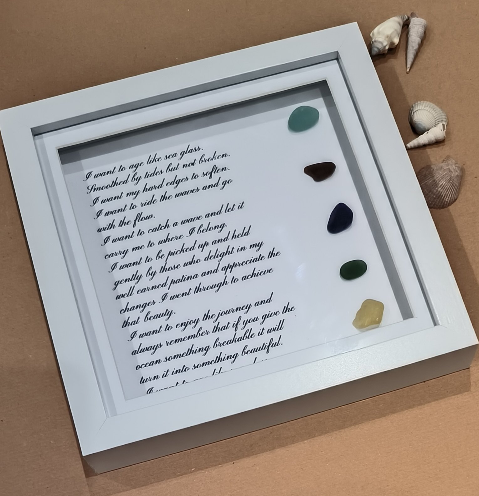 This beautiful frame is all about sea glass and how you would like to age and look .