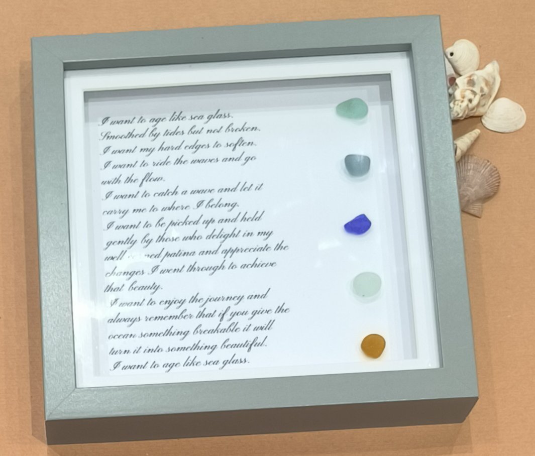 A beautiful frame with the sea glass poem and various pieces of sea glass using a rare piece of sea glass