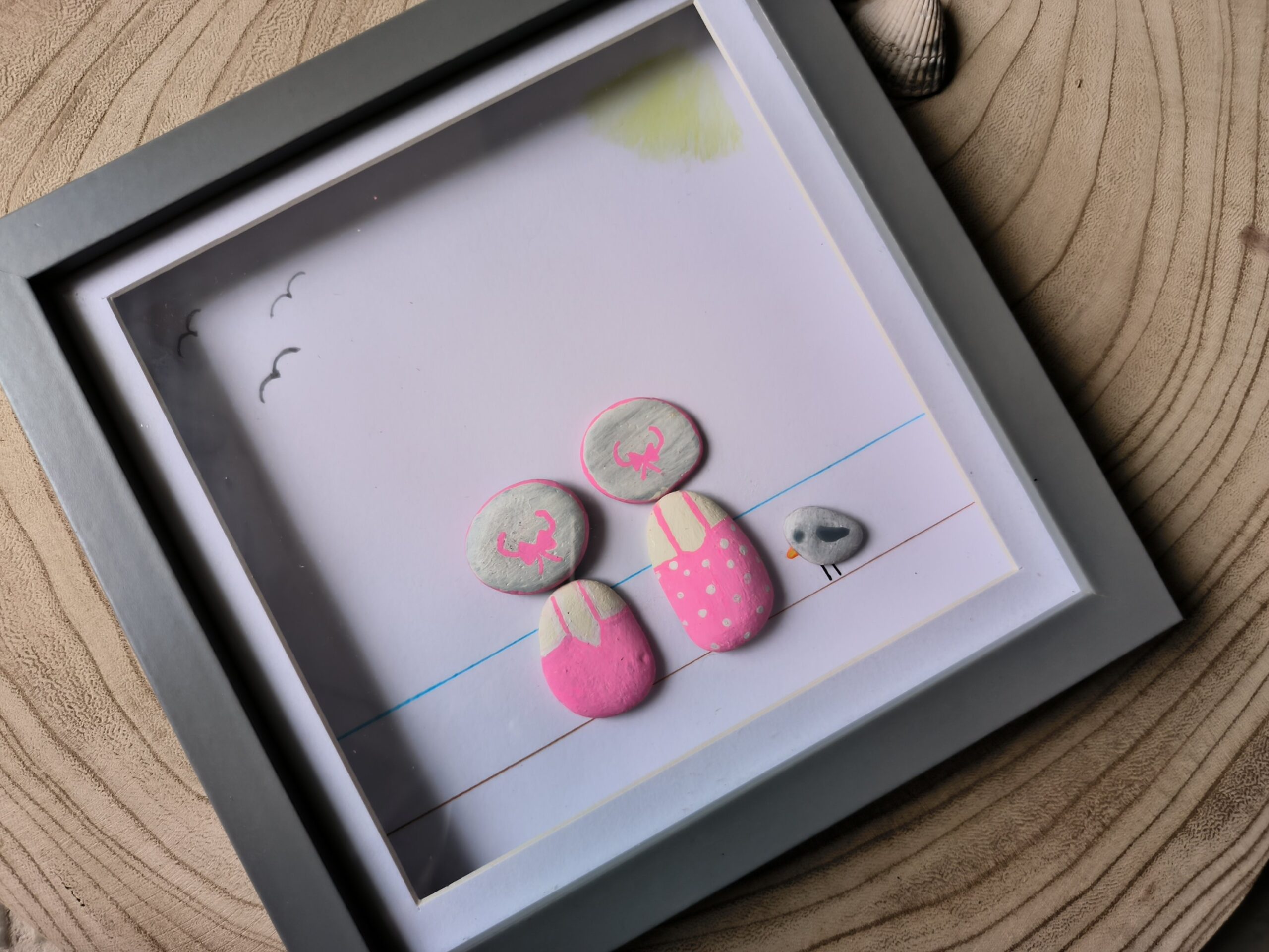 This is a beautiful Summery day scene with pebble sunbathers lapping up the sun with a pebble bird looking on .